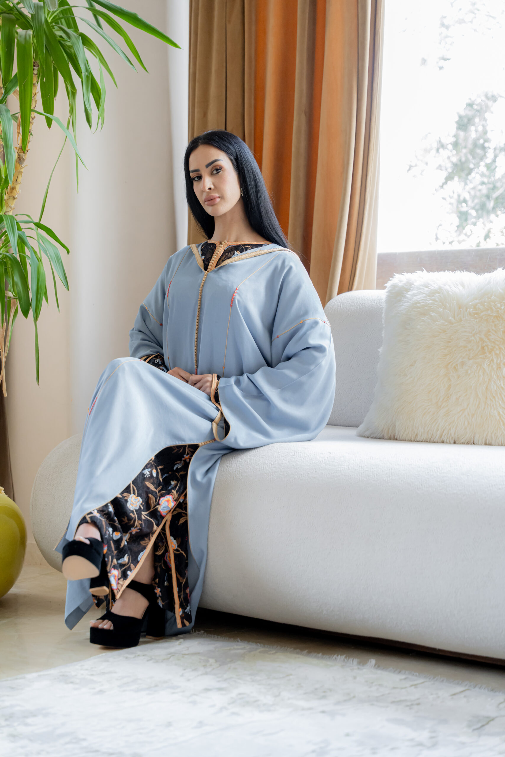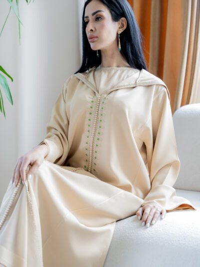 A Moroccan-inspired layered piece with refined sfifa detailing, blending a calm outer silhouette with a richly textured inner reveal.