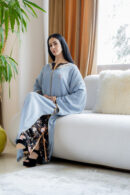 This piece plays on contrast — not through color alone, but through layering and depth. The outer silhouette follows a soft Moroccan djellaba line, fluid and controlled, while revealing a richly detailed inner layer that shifts the entire presence of the garment.