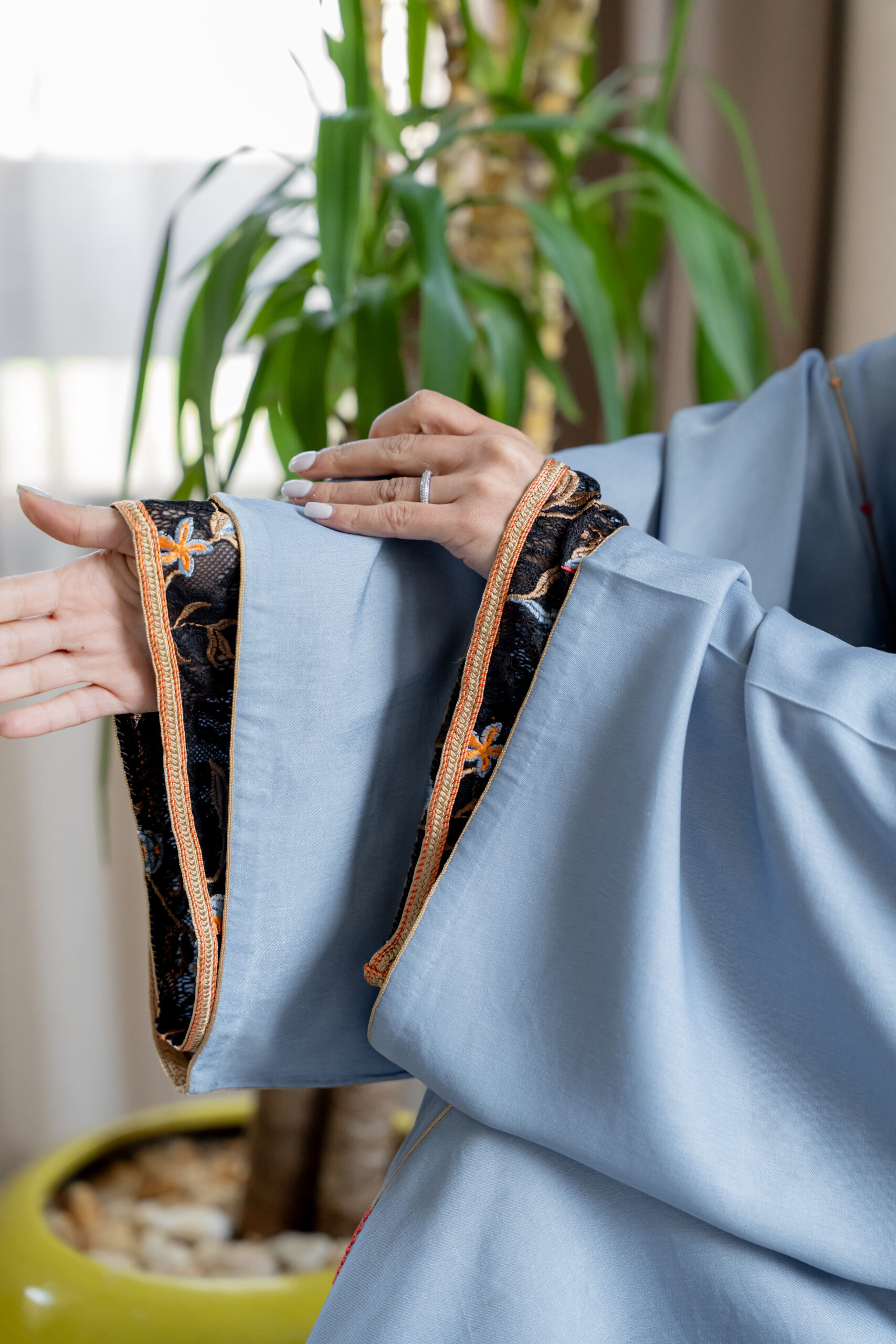 The outer fabric is smooth and matte, allowing the color to remain calm and refined, while fine sfifa tracing adds structure along the neckline and openings. Subtle embroidered touches are scattered across the surface, almost like quiet signals rather than decoration.