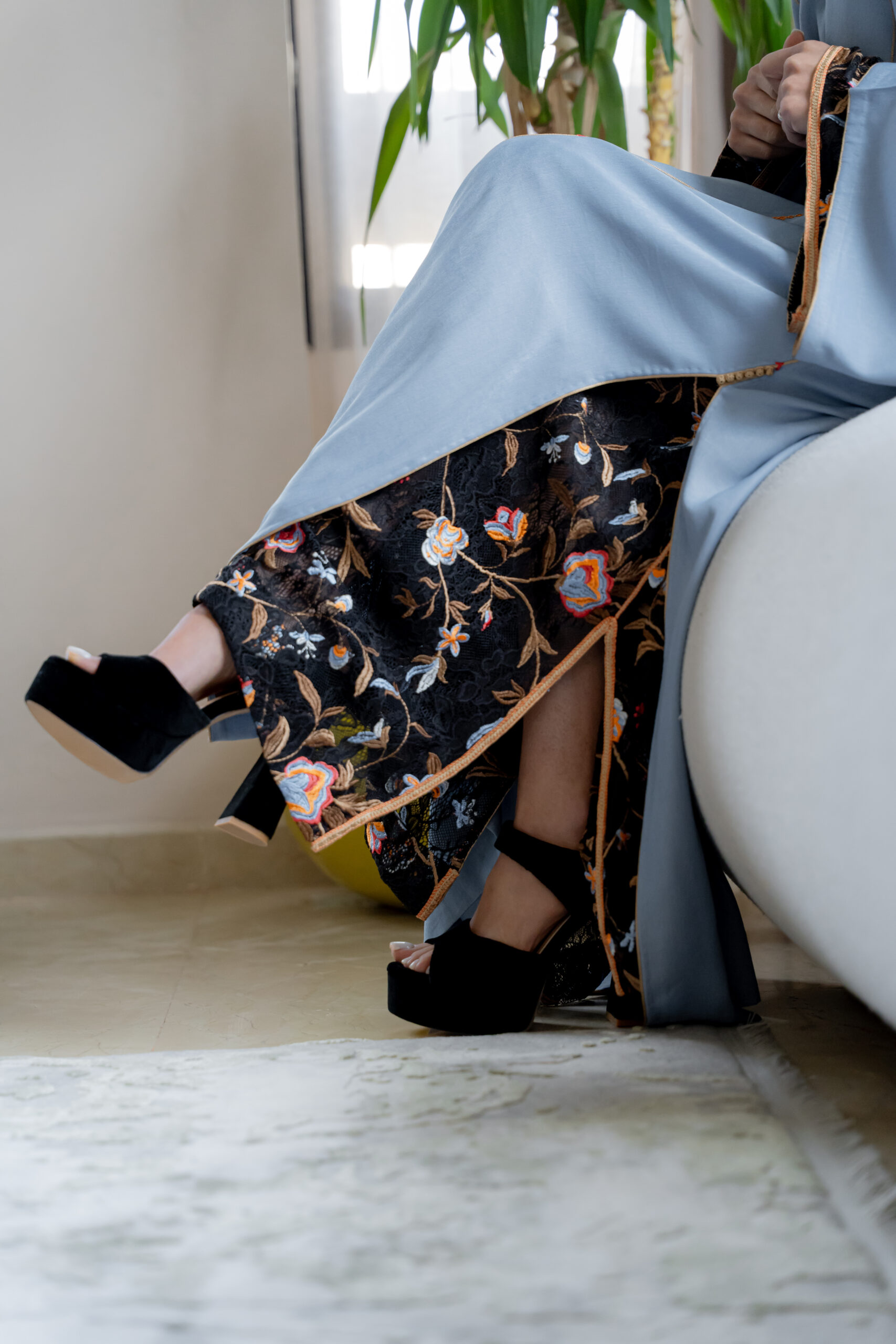 What defines the piece is the interior reveal: a darker floral layer appears at the neckline, sleeves, and movement points, creating a dynamic interplay between restraint and richness. This duality anchors the design in a contemporary reinterpretation of Moroccan craftsmanship — where layering replaces excess.