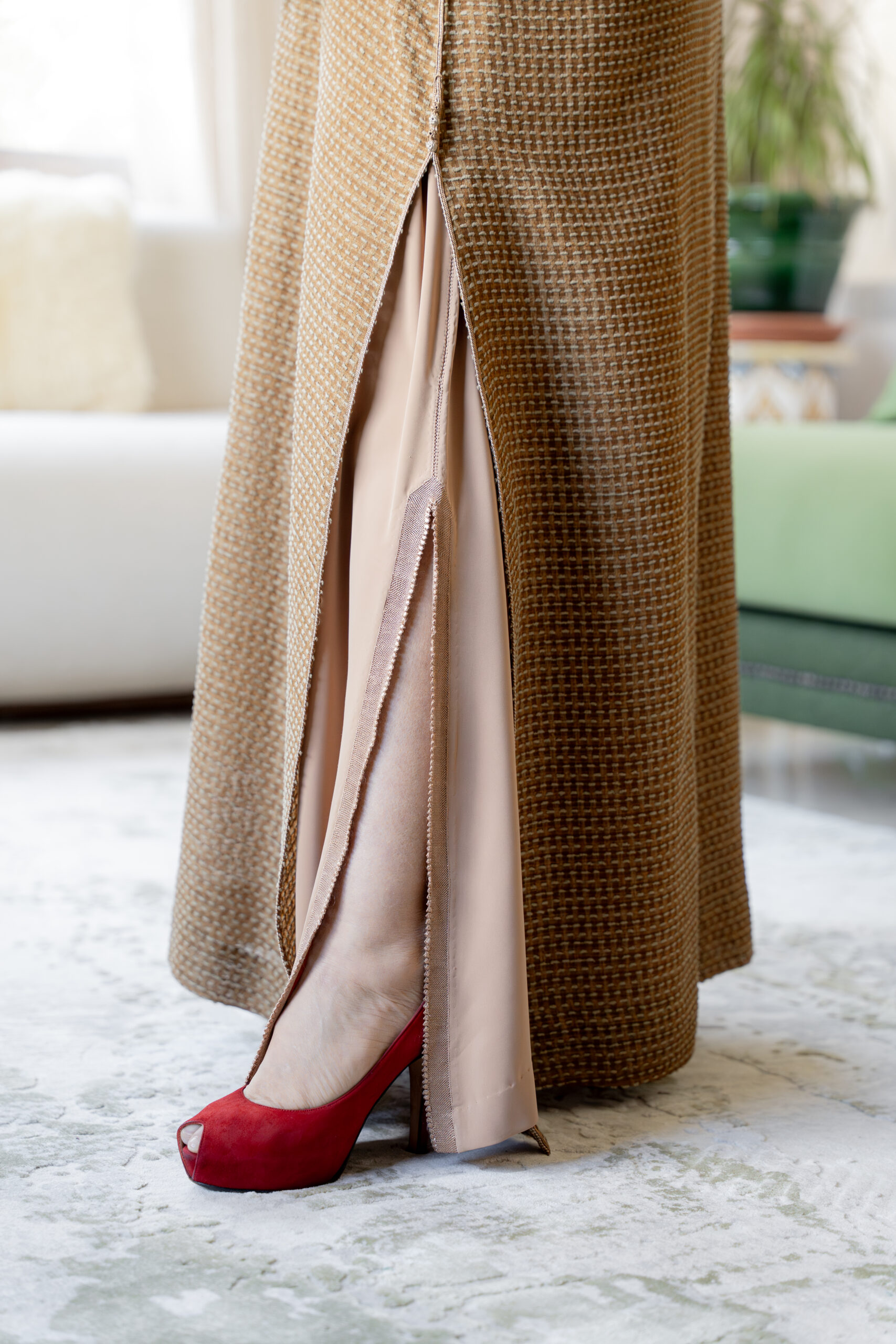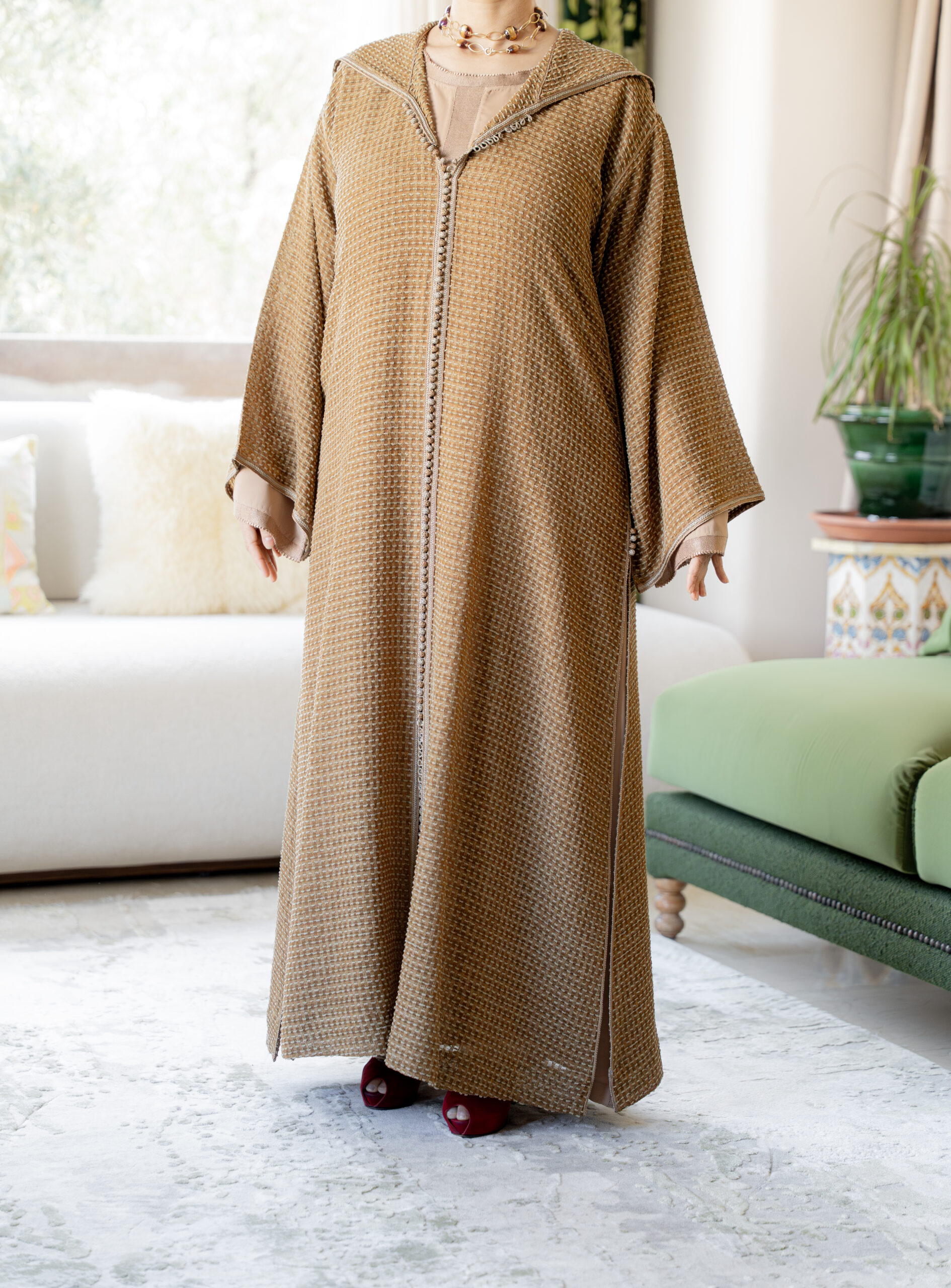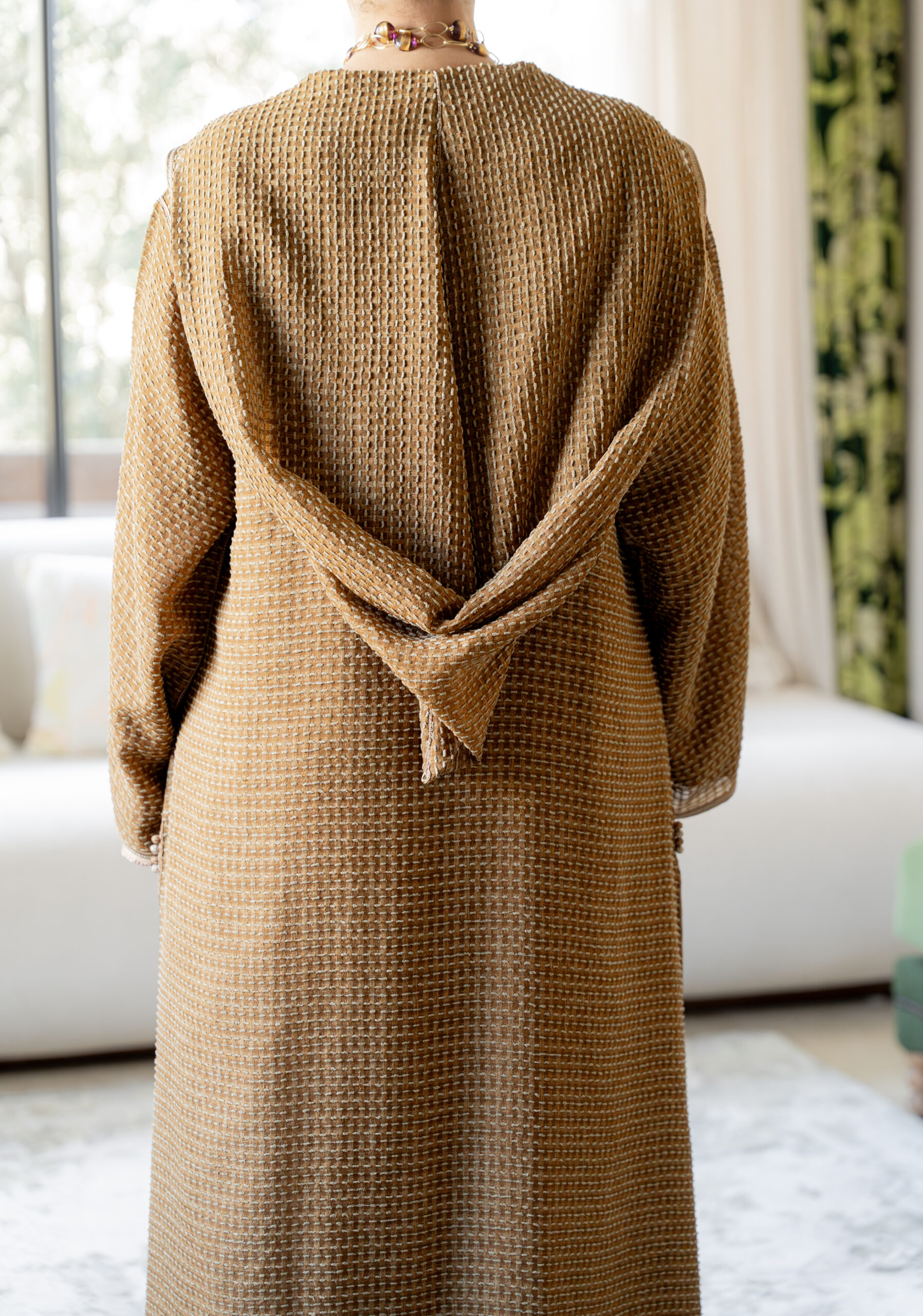 The tone, rooted in warm earthy shades, enhances the visual weight of the texture, giving the piece a grounded and refined character. The finishes remain minimal and precise, letting the fabric itself carry the identity through its intricate surface and balanced construction.