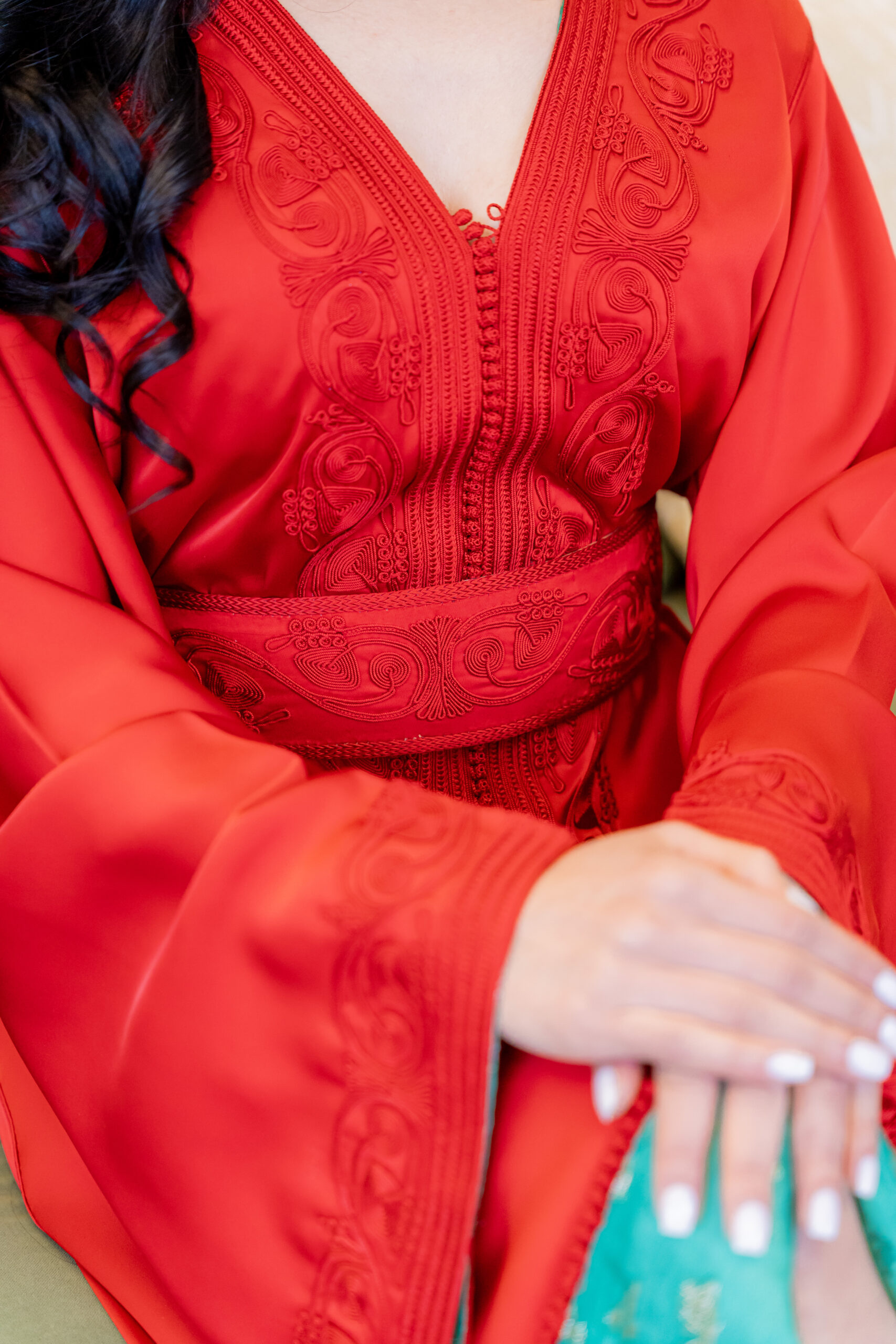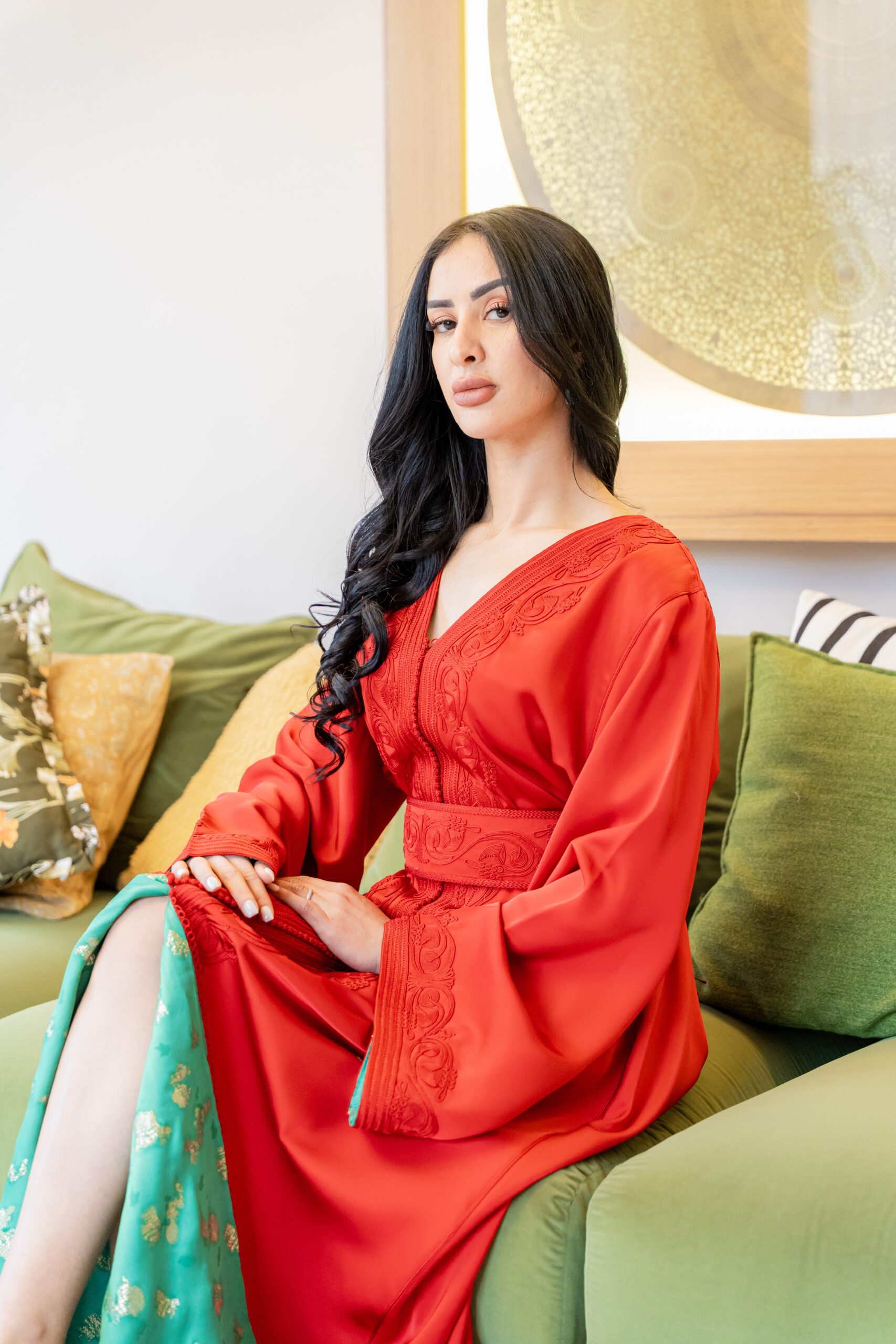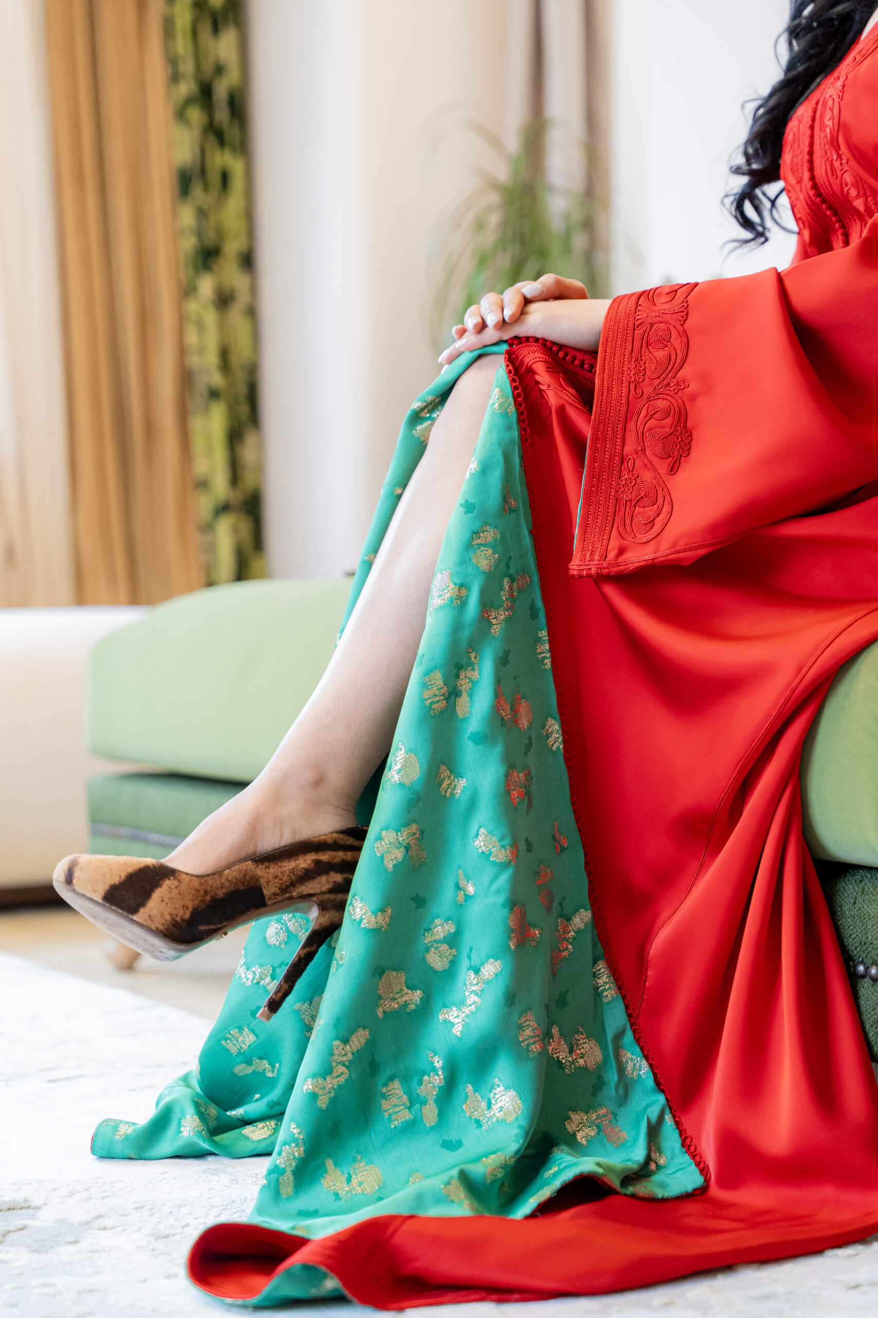 The red is clean and saturated, giving the caftan a strong, defined presence. But it’s the interior that shifts the perception — flashes of green appear as the fabric opens, adding depth and a sense of layering that feels intentional rather than decorative.