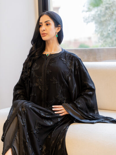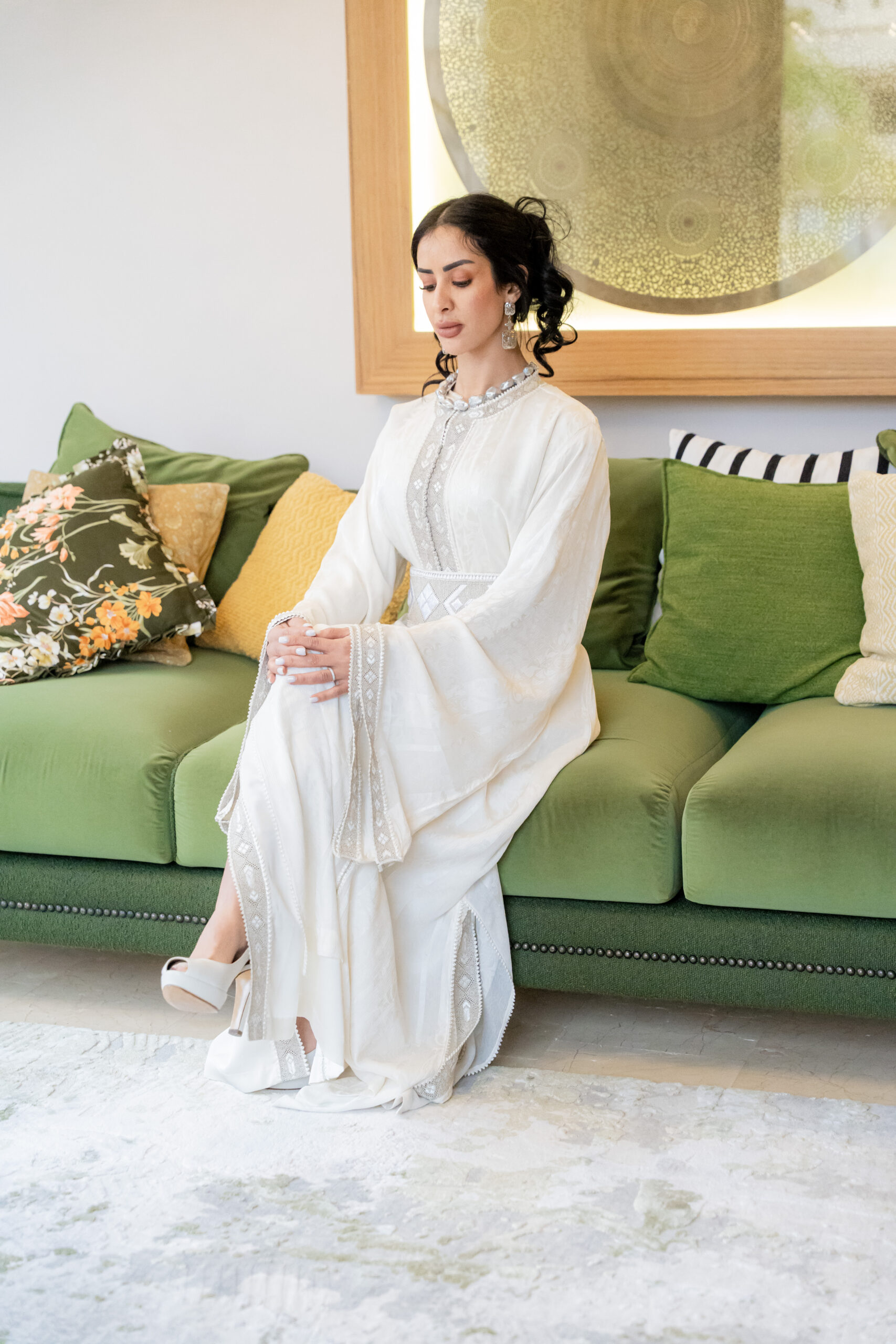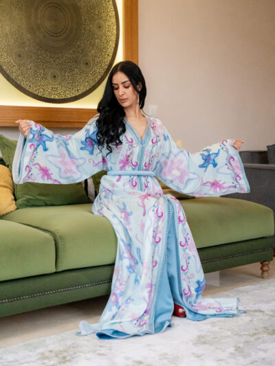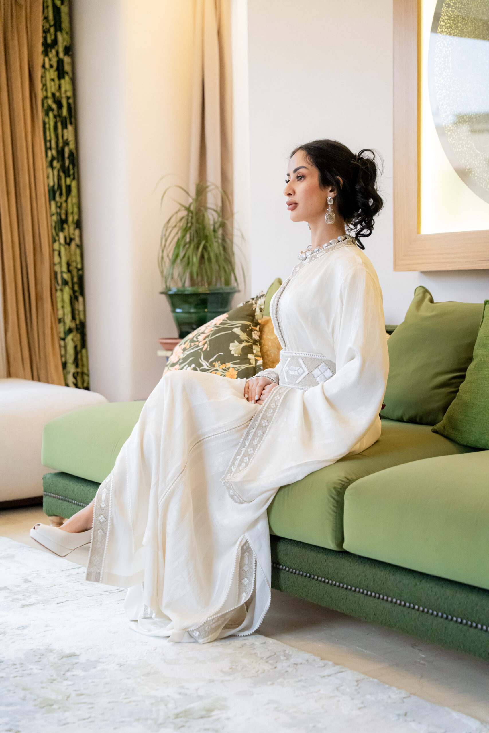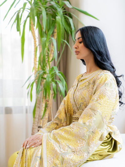 The waist is gently defined, bringing balance to the volume of the sleeves and the length of the caftan. Everything feels aligned — nothing excessive, nothing competing.