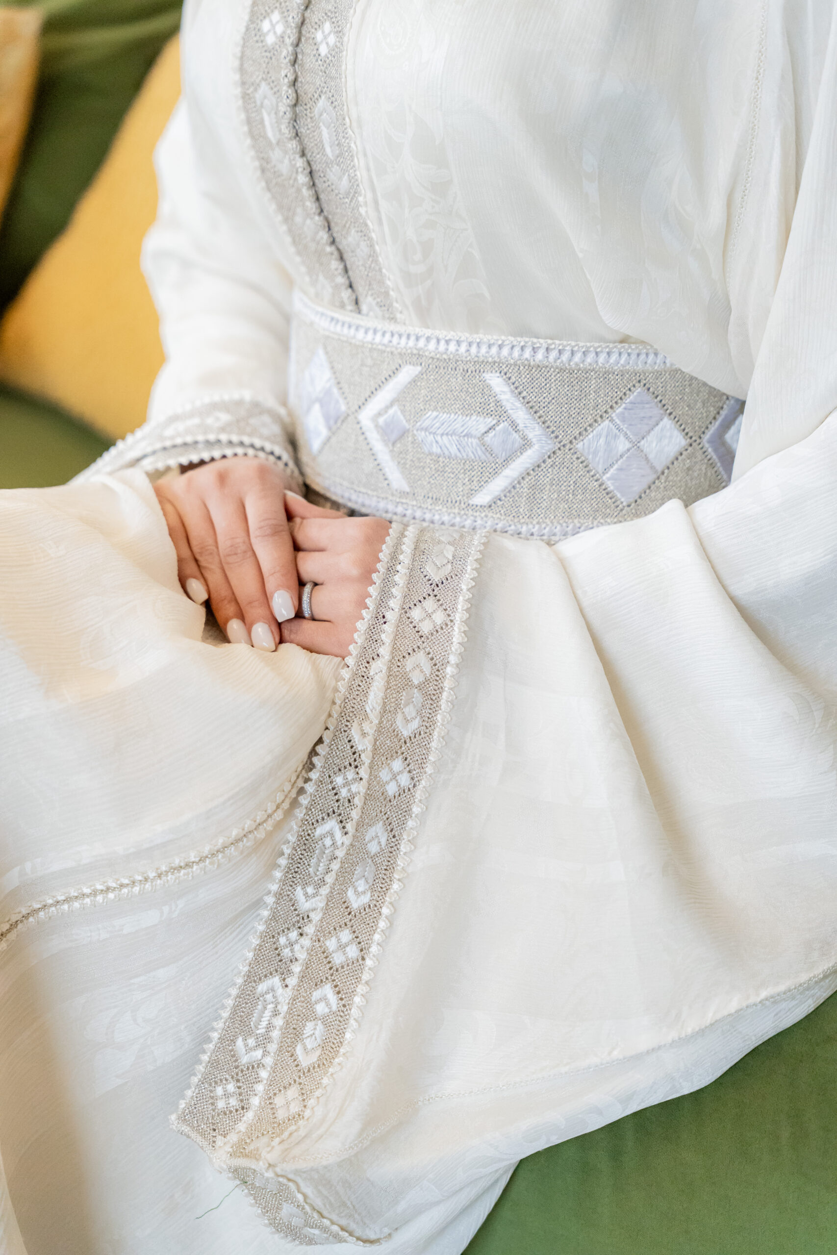 White caftan crafted in silk tlija, entirely handmade. Adorned with delicate randa work, skalli hor, and silk thread embroidery, creating a refined and timeless piece.